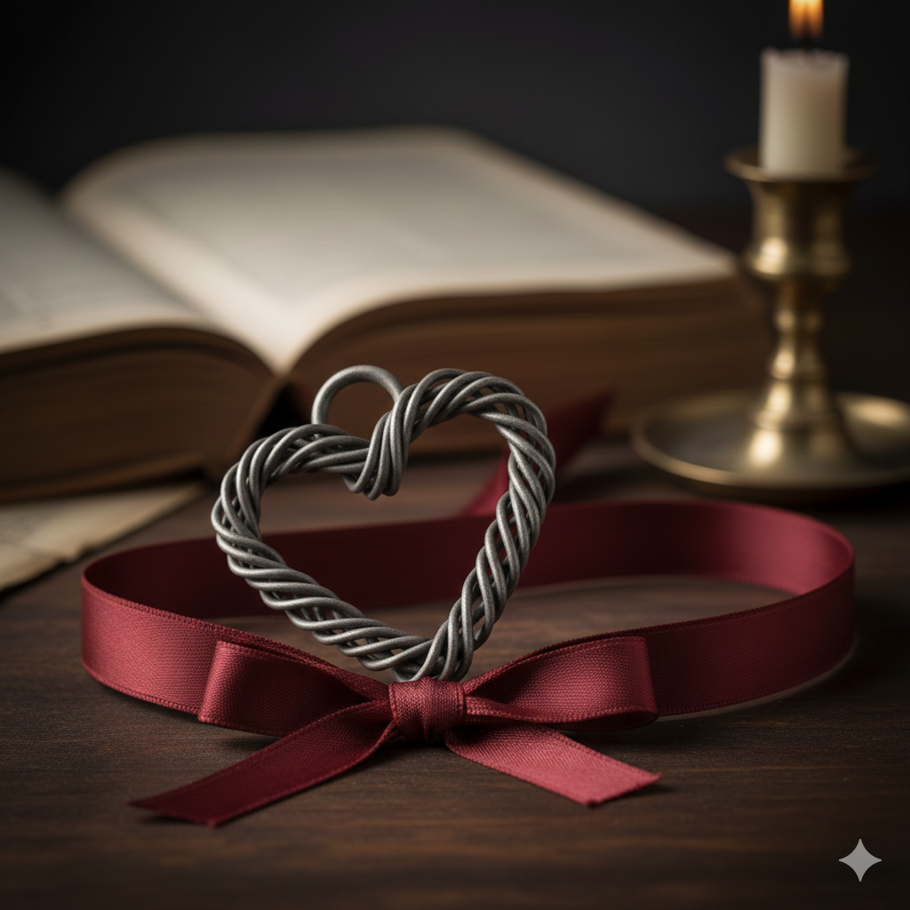 Spíš tedy srdíčko, klasický tvar vytepaný z matně šedého kovového drátu spleteného z několika kovových pramenů jako cop, s očkem na pověšení.